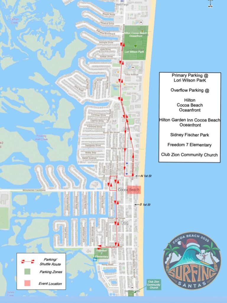 Parking in Downtown Cocoa Beach during Surfing Santas can be a bit hectic, however there are plenty of metered parking spaces in the parking garage and on the streets of Cocoa Beach. Check out this website for a comprehensive list of all the parking spaces in Cocoa Beach, and the opportunity to download the Passport Parking Mobile App for a seamless parking experience. Cocoa Beach has over 1,600 public parking spots. Parking illegally in residential neighborhoods may get you ticketed or impounded. Please pay when you arrive to avoid tickets.